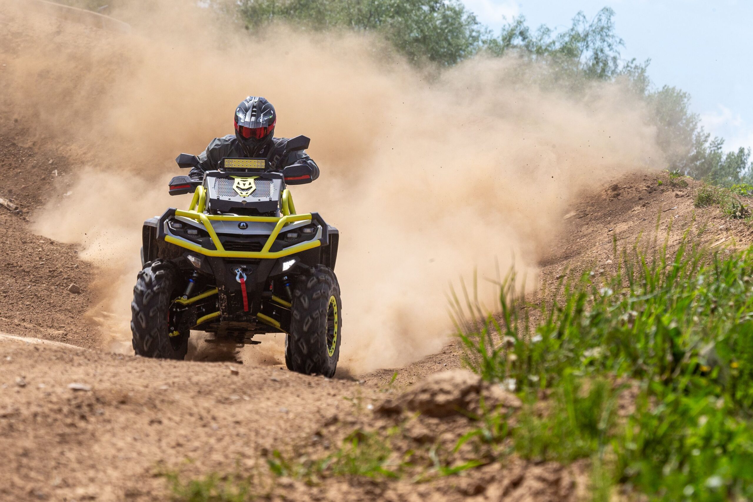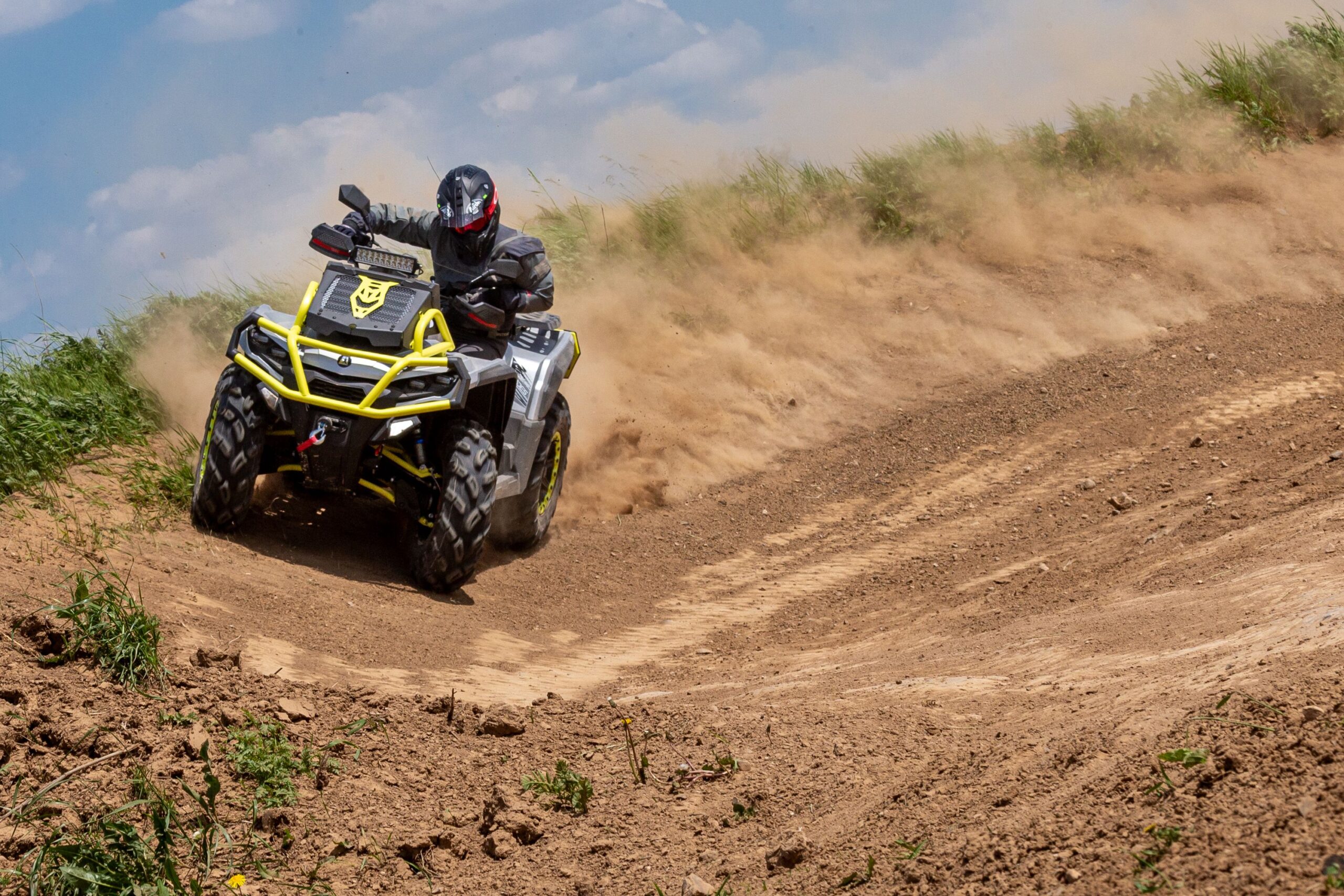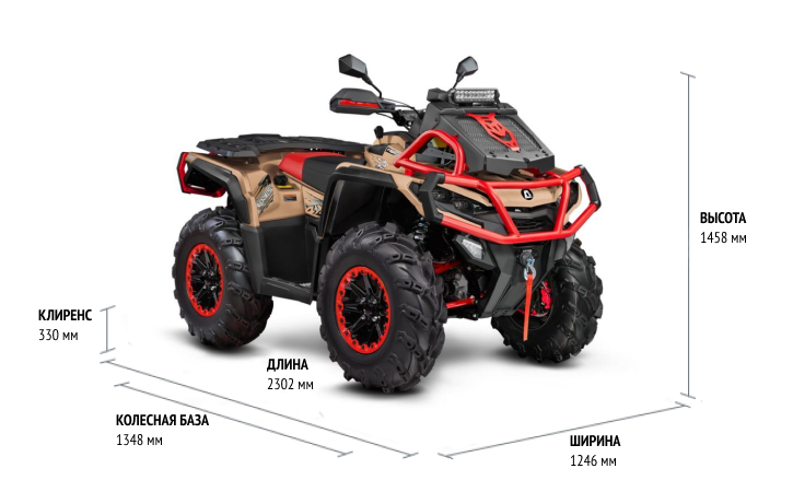 Одноместный квадроцикл с литровым мотором 91 л. с. Для мокрых маршрутов и глубокой грязи. Короткая база, клиренс 33 см, вынос радиатора в комплекте, 30-дюймовые колеса с бедлоками и грязевым протектором.
