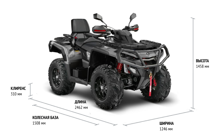 Мощный двухместный квадроцикл для бездорожья любой сложности, подходит для мокрых маршрутов: грязи, бродов, топкой мягкой почвы. Предназначен для развлечений, путешествий и работы. Клиренс увеличен до 31 см, а у покрышек Y-образный высокий протектор.