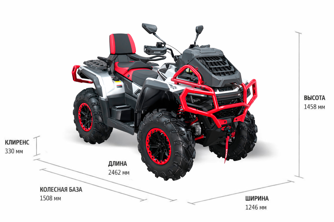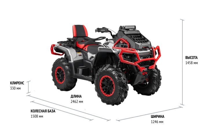Мощный квадроцикл для мокрых маршрутов: грязи, бродов, топкой мягкой почвы. За счет длинной колесной базы стабильно и плавно управляется, устойчив на поворотах.