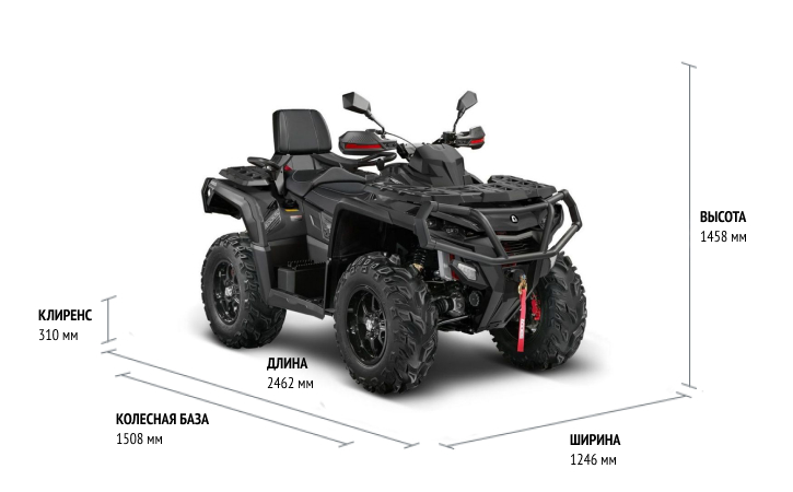 Двухместный квадроцикл для развлечений, путешествий и несложной работы. Подходит для мокрых маршрутов: грязи, бродов, топкой мягкой почвы. За счет длинной колесной базы стабильно и плавно управляется, устойчив на поворотах. Клиренс увеличен до 31 см, а у покрышек Y-образный высокий протектор.