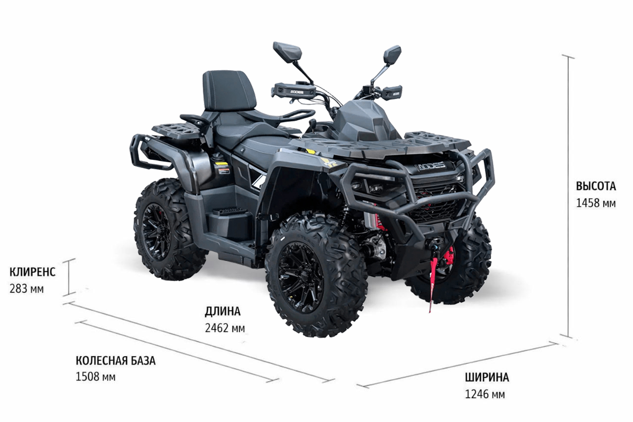 Двухместный квадроцикл для развлечений, путешествий и несложной работы. Подходит для бездорожья средней сложности без глубокой грязи. За счет длинной колесной базы стабильно и плавно управляется, устойчив на поворотах.