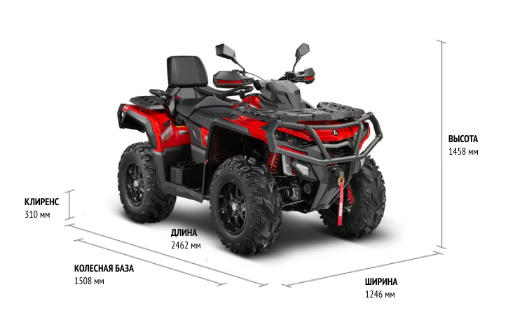 Двухместный квадроцикл для развлечений, путешествий и несложной работы. Уверенно едет по бездорожью средней сложности без глубокой грязи. За счет длинной колесной базы стабильно и плавно управляется, устойчив на поворотах.