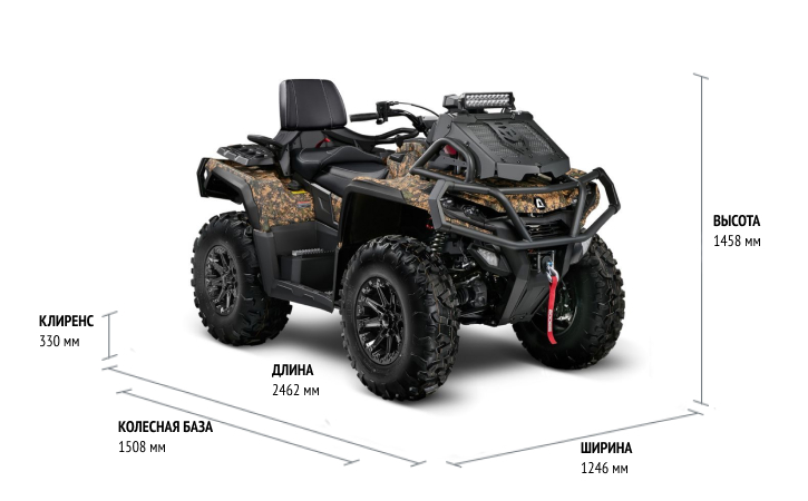 Двухместный квадроцикл с литровым мотором 91 л.с. Новинка 2025 года, выпущена специально для РФ. Отличается улучшенной подвеской. Клиренс 33 см, 29-дюймовые колеса, вынос радиатора и дополнительный свет в комплекте.